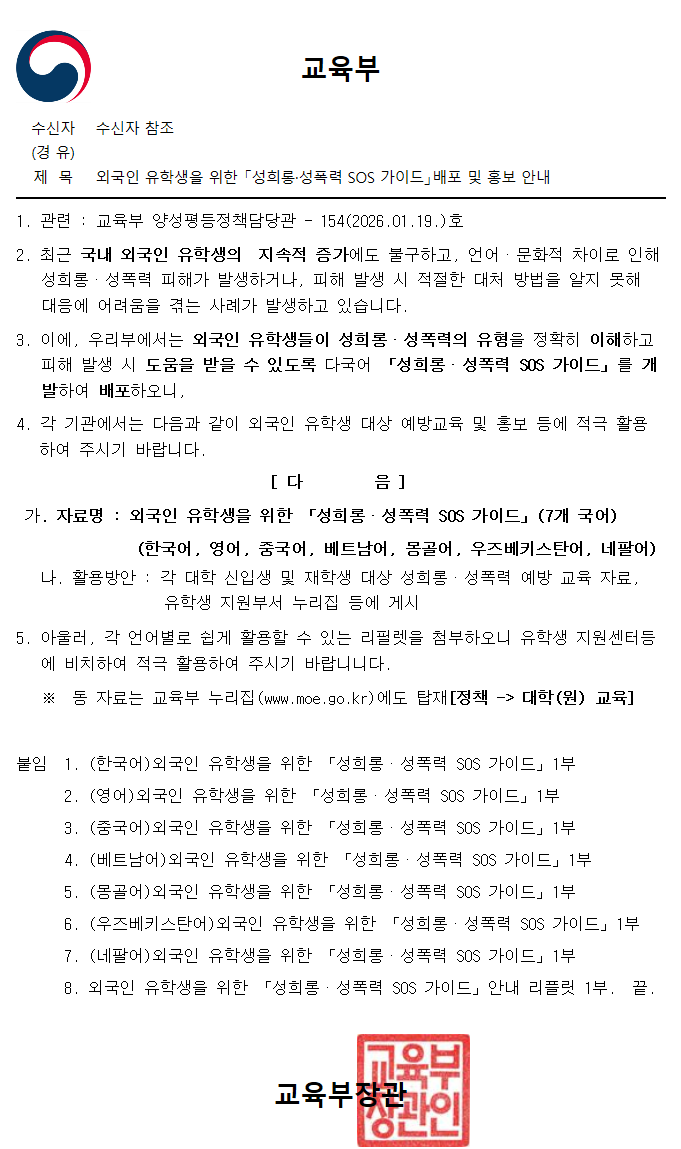 외국인 유학생을 위한 「성희롱·성폭력 SOS 가이드」배포 및 홍보 안내