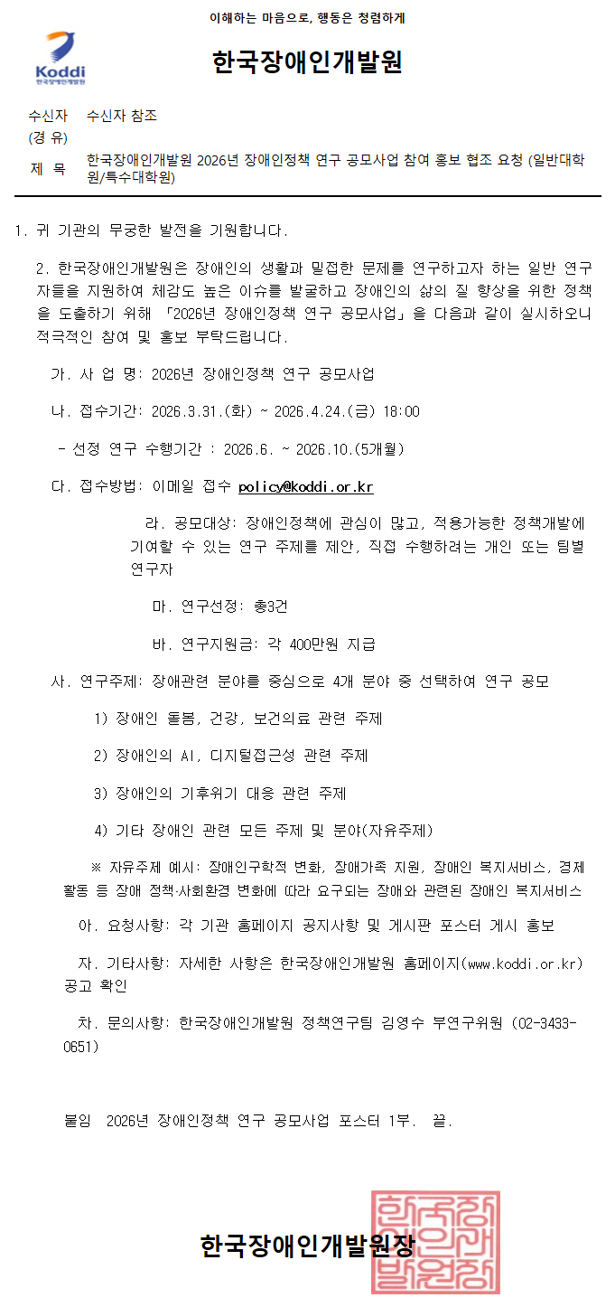 한국장애인개발원 2026년 장애인정책 연구 공모사업 참여 홍보 협조 요청 (일반대학원/특수대학원)