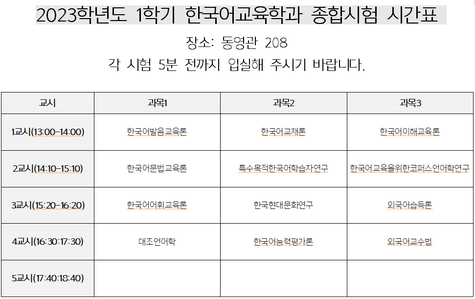 시험 일시: 5월 26일 (금) 오후 1시, 각 교과목당 60분