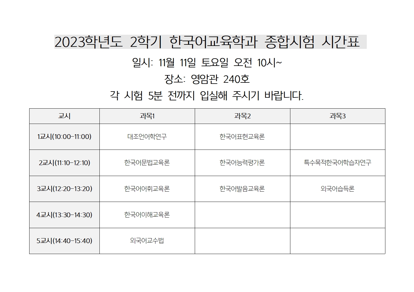 시험 일시: 11월 11일 (토) 오전 10시, 각 교과목당 60분