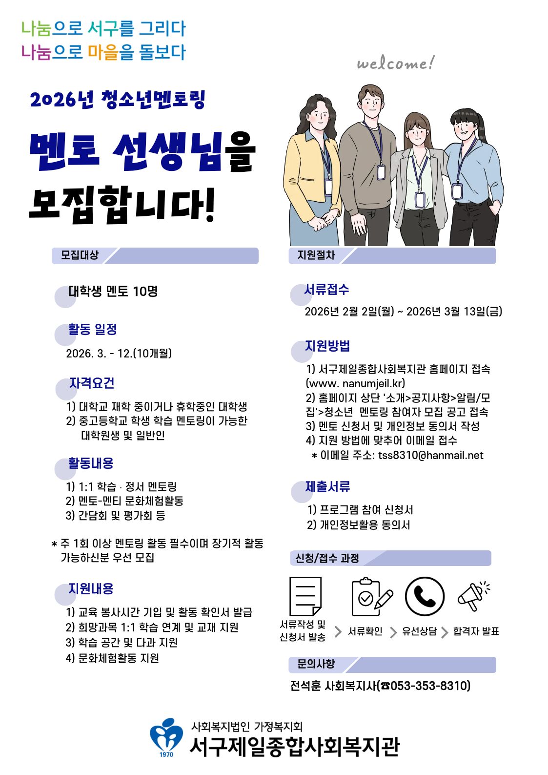 2026년 서구제일종합사회복지관 청소년 멘토링 프로그램 홍보 및 참여자 추가 모집 안내